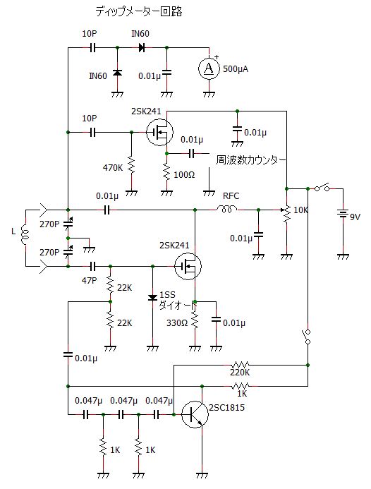 ディップメーターは、元々真空管によるグリッドディップメーターと呼ばれていました。今から50年以上前のアマチュア無線愛好者は、テスターの次に必要な測定器としてグリッドディップメーターをあげていました。受信機や送信機を自作するときにコイルを造ったり、アンテナの調整に利用していました。ディップメーターとは、プラグインコイルを差し替えて、幅広く周波数を変えることができる微弱な発振器です。コイルやアンテナと共振して発振強度が変わることをメーターの動きとして見ることができるので重宝しました。また、簡易的にテストオシレーターとしても利用することができます。その後真空管からトランジスターになって、持ち運びができるようになって便利なディップメーターが使われました。
