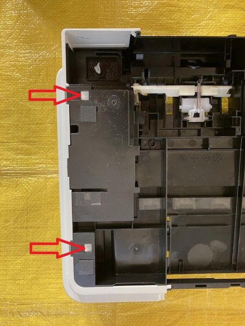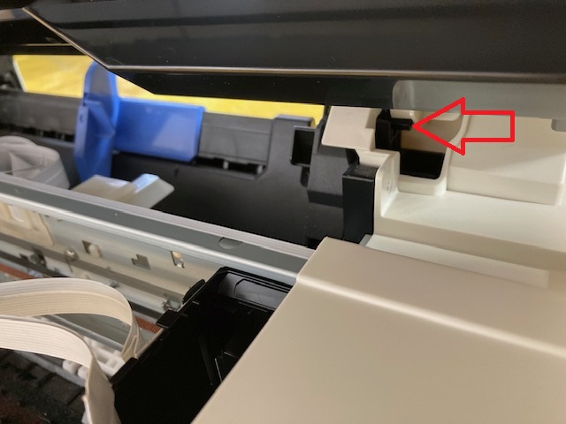 3.スキャナーユニットを支えている水色の支柱の下側を両側からつまんで外します。